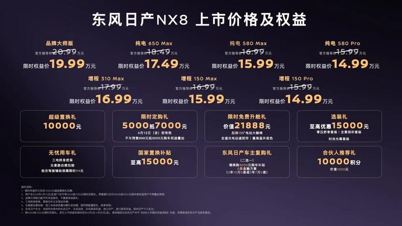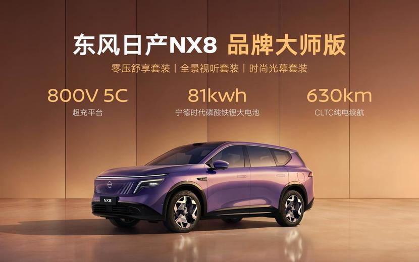 东风日产NX8推出纯电、增程两大动力序列共六大版本,官方指导价15.99-18.49万元,叠加4月30日前置换直减1万等八重上市权益,限时权益价下探至14.99-17.49万元。同时品牌大师版同步登场,搭载800V 5C超充、81度大电池,纯电续航630km,配备无框电动门、电控减震器等豪华配置,限时权益价19.99万元,满足高端家庭需求。纯电车型上市即交付,增程车型5月中下旬开启交付,快速兑现用户期待。